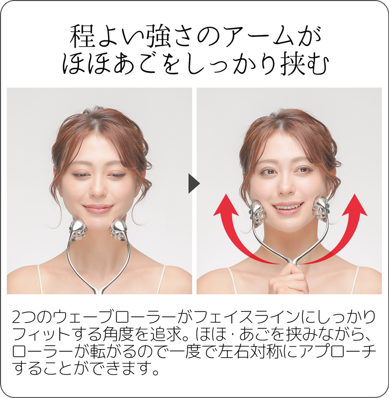 2つのウェーブローラーがフェイスラインにしっかりフィットする角度を追求。ほほ・あごを挟み込みながらローラーが転がるので、一度で左右対称にアップローチすることができます。